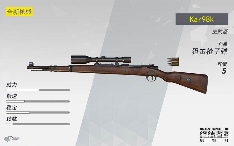 Kar98k是十分优秀的旋转后拉式枪机步枪,也是产量最大的轻武器之一,在战场上有着非常出色的表现。而在《终结者2:审判日》中,Kar98k的定位是狙击步枪,可以装配狙击枪枪头以及托腮板,弹匣可装填5发子弹,只可单发射击。
