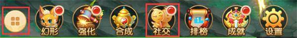先点击游戏主界面右下方的纽扣状图标,会弹出菜单栏,再点击菜单栏中的“社交”,即可查看社交界面。