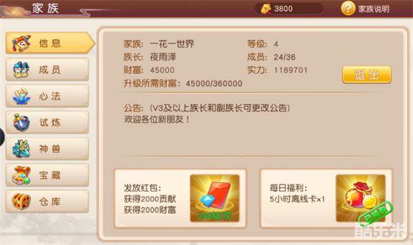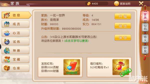 界面分别有家族、仙侣、结义、好友4个选项,随着等级增长逐渐激活