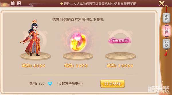 结仙侣需要花费520钻石(发起方全额支付)