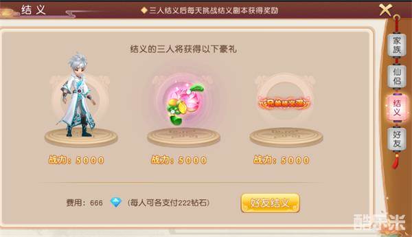三人结义需花费666钻石(每人可各支付222钻石)