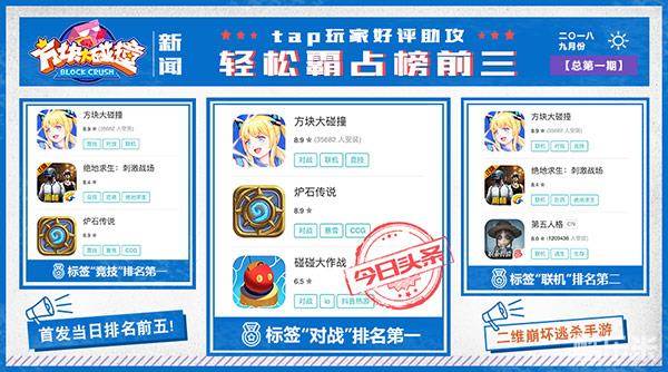 《方块大碰撞》上线一周,就凭借精良的制作收获了TapTap与好游快爆两个游戏平台的编辑推荐、并在TapTap游戏取得了新品榜第二位,下载榜第三位,对战类手游热度排名第一等等优秀的成绩!