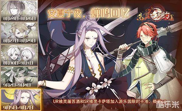 9月5日——9月7日,UR飨灵屠苏酒与新SR飨灵卡萨塔加入限时卡池,概率UP,喜欢收集和渴望升星的御侍,可要看准此次机会出手啦。
