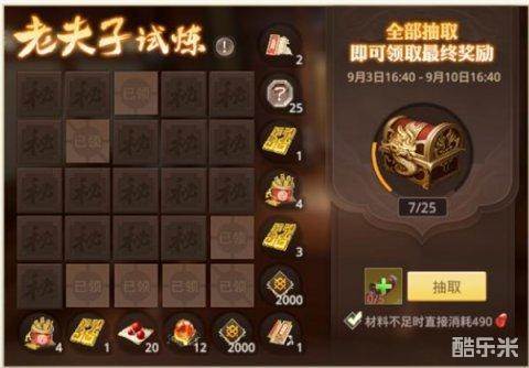 在老夫子试炼中,主事大人通过消耗夫子试炼卷进行九宫格游戏。每消耗一张夫子试炼卷都会随机点亮一个格子,且每个格子只会被点亮一次。每点亮一个格子都将获得奖励。如果你足够幸运还会有惊喜哦!