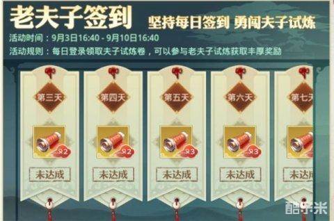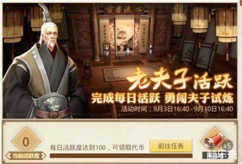 俗话说:天道酬勤!所以老夫子为勤奋的玩家准备了老夫子签到活动,只要每日上限完成签到,就可以获得夫子试炼卷。此外,主事大人们可以参与老夫子活跃活动,完成每日任务累积到指定的活跃度,也能获取夫子试炼卷哟!