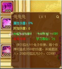 兔兔兔:不过这招PK必备,真的可以让对手吐死,原先的兔子炸弹够彪悍的了,这次20级还一次3只。。。追着对手漫天跑啊~~~亮点技能!