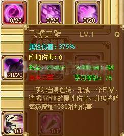飞檐走壁:发出一条龙卷风攻击对手,类似于倒悬踢= =但是没什么逃跑作用,对手会随着你的龙拳风而前进,也就是永远在你面前......攻击力还好。。。CD也蛮短,不怎么推荐,可留可不留;
