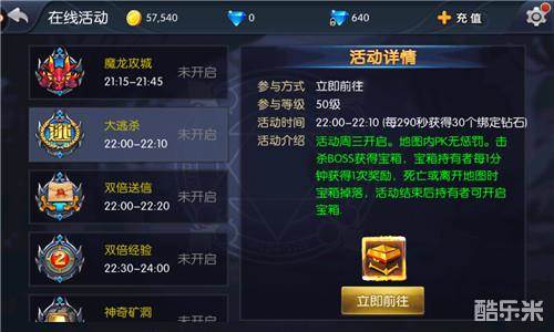 大逃杀,50级就可以参与的宝箱活动,打完魔龙来一把十分钟的大逃杀,看谁笑到最后,据说此地图PK没有惩罚,击杀boss可以获得宝箱,宝箱持有者每分钟可以获得一次奖励,死亡或离开地图宝箱掉落,所谓螳螂捕蝉黄雀在后,看谁可以最后一个打开箱子(活动时间为10分钟,每290秒可以获得30个绑定钻石),拿不到宝箱拿一些绑定钻石也是非常好的。不过小编还是有一点好奇,这个箱子里到底是什么?