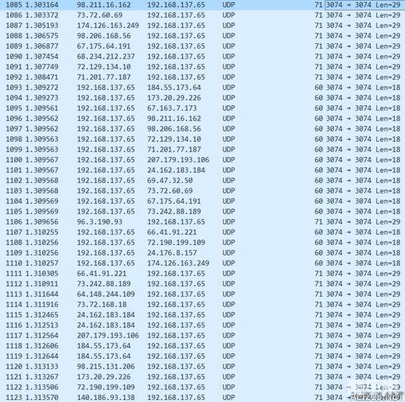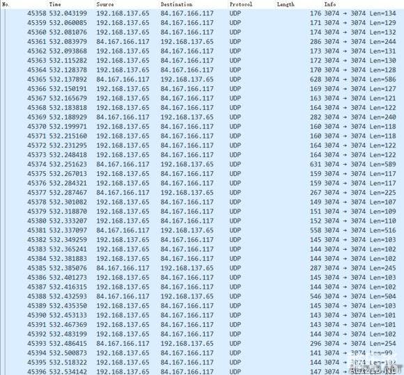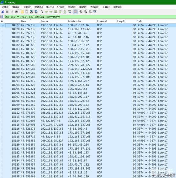 抓包工具一分钟抓到了几万条记录,通过筛选出部分结果可以看出游戏热更新之后的某一阶段会和各地的服务器进行交流,应该是在测延迟。本地端口3072是COD联机常用的端口,远程端口44999: