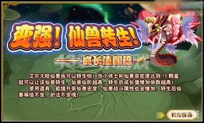 功夫派尔大陆仙兽也可以转生啦!当小侠士和仙兽亲密度达到10颗星,就可以让该仙兽转生,仙兽仙阶越高,转生后成长值增加倍数越高!大家一定要记得只有角色转生了,仙兽才可以转生哦!