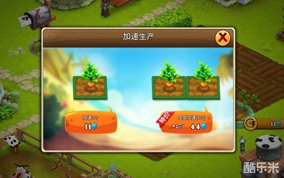 我们看到如果全部加速,花费会打5折,只需要花费44个闪电就能全部加速立即完成8块地的胡萝卜,足足省了44个闪电!