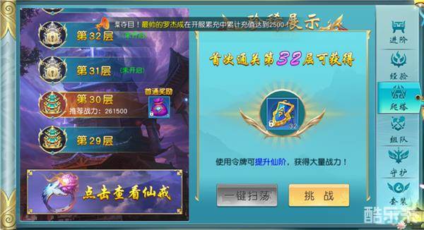 【经验副本】、【组队副本】、【守护副本】和【套装副本】玩法与上述类似,在此不一一累述,此次小编着重给大家讲解下游戏独创的“仙戒系统”玩法,也就是【爬塔副本】通关攻略!
