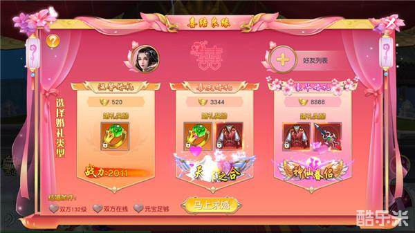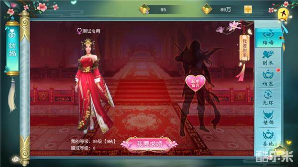 在结婚系统页面,点击【我要求婚】来到“月老”处,与心爱的TA组队,向月老登记结婚。需要注意的是双方必须是好友,且满足结婚条件才可结婚成功哦!