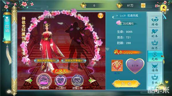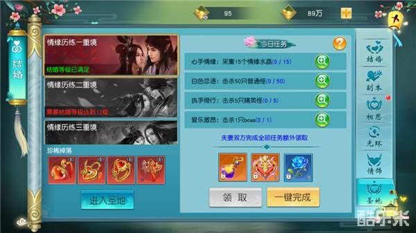 【副本】需要双方组队状态下才可进入挑战,【圣地】玩法单人也可以进入。在情缘圣地玩家可以获得各种强大的情饰装备。圣地内设有情缘历练任务,结婚等级越高,任务奖励越丰厚。如果夫妻双方都圆满完成任务,双方还可额外获得丰厚奖励。任务进度每天12点会自动刷新,请及时完成哦。