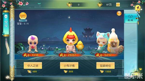 宝宝获取途径:在宝宝的抱娃界面,有三种不同的宝宝可供选择,最多可培育5个宝宝。宝宝战力夫妻双方共享,可对宝宝进行资质属性提升和阶数提升。