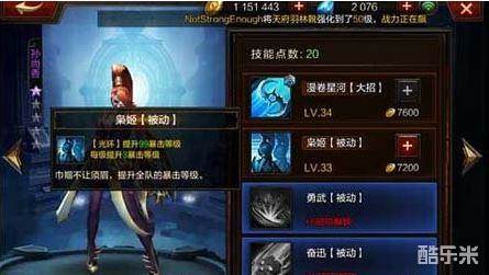 孙尚香同样拥有一个大招技能和三个被动技能。其技能最大的亮点便是自带暴击光环,配合夏侯惇等靠暴击作战的武将,满屏暴击黄字,简直酸爽!