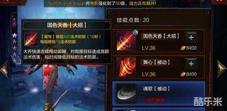 【大招】国色天香:【属性】降低15法术防御(10秒),每级降低15法术防御;【效果】大乔快速连续甩动脚鞭,对目标造成高额法术伤害,短时间内降低目标法术防御。