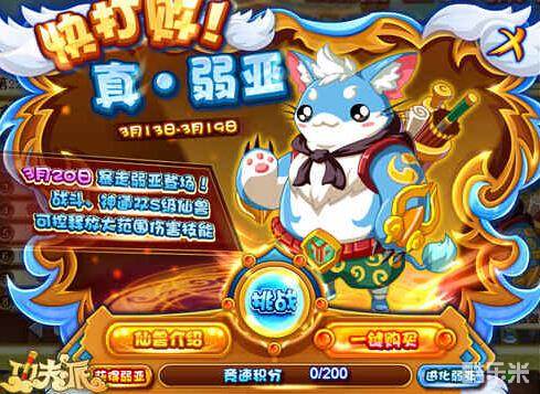 功夫派走弱亚登场,战斗、神通双S级仙兽,可控释放大范围伤害技能,每天有5次免费的挑战机会,每次挑战时间1分钟,击杀真·弱亚可获得1点竞速积分,击杀弱亚将扣除2点竞速积分。