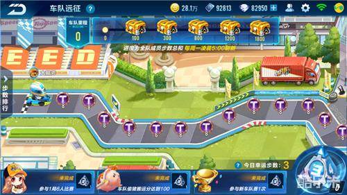 车队远征同样是本次新加入的休闲玩法,玩家可以通过完成每日三个随机的骰子任务来获得骰子,然后使用骰子投出数字,进而使赛车前进相应步数,有些类似大富翁的玩法。而在路上和终点的奖励,玩家也可以一并收下。每天凌晨5点还会刷新幸运暴击数字,当天投出的数字与幸运暴击数字一致的话,玩家收获的奖励数量将会提升。值得一提的是,本周全队队员的步数之和达到一定数量后,全队都能领取对应宝箱。