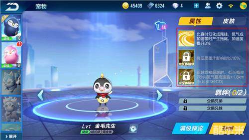 金毛先生和企鹅囡囡拥有【企鹅兄妹】羁绊,羁绊效果是属性3氮气最高速度+0.8km/h,与原本属性2 最高增加3.7 km/h的数据叠加,最后属性3在羁绊的帮助下氮气最高速度可以增加至+4.5km/h,进而可以让玩家在触发属性3后可以更为轻松的追击对手或领跑。