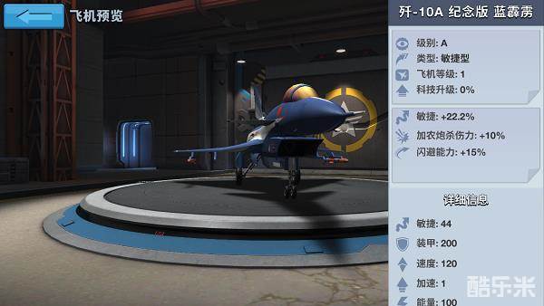 游戏中国庆限时三折特惠战机歼-10A纪念版 蓝霹雳,属于敏捷型A级战机。在未升级状态下,敏捷值44,速度120,加速时间为1秒,能量值100,在近距离格斗时,轻巧灵活,能够快速转弯对敌方实行锁定攻击。在升级蓝图和科技并安装敏捷型装备后,蓝霹雳的性能将会得到显著提升,在联机对战和刷地图任务时是一款不可或缺的战机。关键是歼-10A蓝霹雳在国庆特惠期间仅需240钻,超低价格获得超值实惠,真的不能错过。