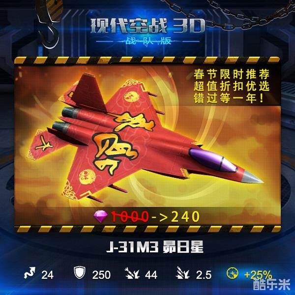 J-31M3昴日星为春节限时战机,属于S级,仅在1月27-29日(即大年三十、正月初一、初二)三天在商店限时推荐,特价240钻。限时推荐到期之后,系统将不会再次推荐,没有购买的机友即永远的失去了这架纪念版战机的机会。小编温馨提醒大家,备好钻石,注意好时间,把握好机会,错过就真的永远错过了。(注:必须升级至3.6.0版本,游戏商店入口为在机库中点击右上角钻石图标进入)