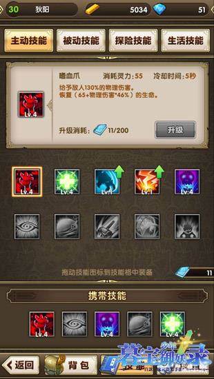 主动技能10个,随着角色的等级提升而逐渐开放,玩家战斗时最多能同时使用5个技能,因此可以根据自身游戏喜好进行技能养成,或走暴击路线,或走平稳路线。技能可以使用技能书进行升级,技能等级越高增加的属性越多。