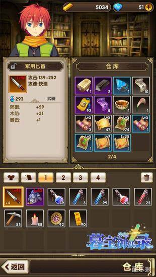 仓库分为4页,每页16格,共64格空间。玩家初始状态下拥有16格容间,别外48格空间需要玩家使用仓库钥匙来解锁,1个钥匙解锁4个格子。仓库钥匙于副本杀怪、开宝箱随机获得,如果玩家脸黑得紧,运气差到爆,可选择在商店秘市中购买。