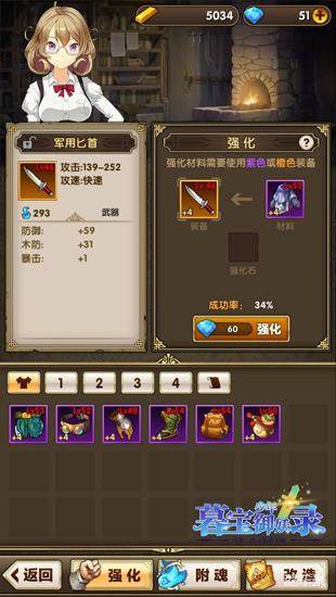 装备可以强化至9级(满级),强化材料为紫色或橙色装备,强化至1-3级花费金币,强化至4-6级花费钻石,强化成功率非100%。