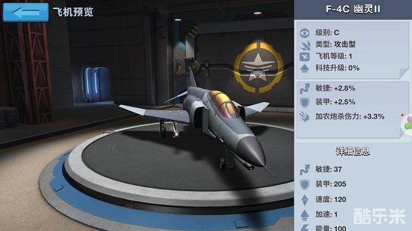 《空战争锋》中鬼怪战斗机名称为“幽灵II”战斗机,优势为C级战机中加农炮杀伤力较高,下方战机属性界面显示的是初始属性,通过科技升级,装备强化和蓝图升级之后会在游戏中会有更优异的表现。