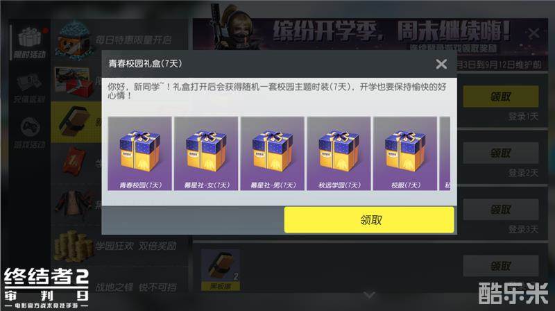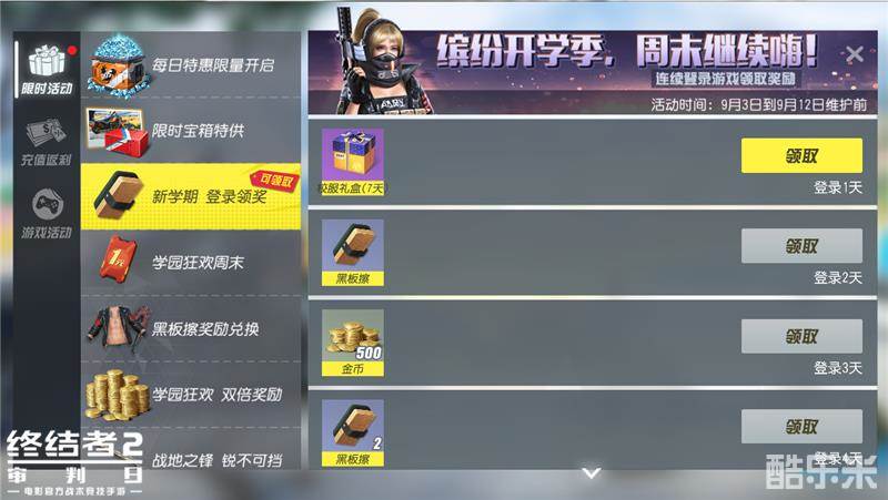 9月3日至9月12日期间,连续登录即可领取包括校服礼盒、金币、黑板擦在内的奖励,其中校园礼盒打开后可随机获得一套校园主题时装(七天),黑板擦则可用于兑换暴走族套装、特训教官等奖励。
