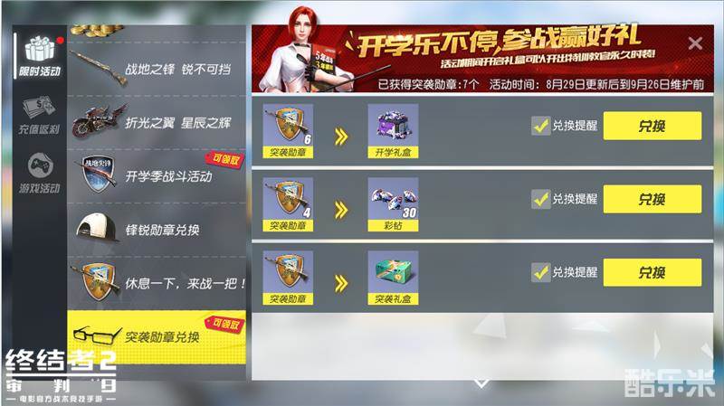 截止9月26日,参与战斗,完成挑战即可获得对应的突袭徽章,突袭徽章能兑换到开学礼盒、彩钻、突袭礼盒等奖励,礼盒中有几率开出特训教官时装,让你从学校摇身变为热辣女教官!