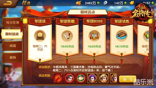 开服第8天及以上加入军团的主公可以参与活动,每周二、周六21:00开始,活动持续16分钟,1分钟准备,15分钟战斗。