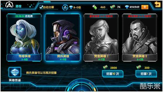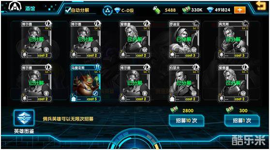 2)选择招募方式和次数即可抽取英雄卡。玩家可以根据自己的需求,选择招募方式,如选择招募A-D级的佣兵英雄,可以一张张来碰运气,也可以十张十张地大批量抽取。不会用到的英雄卡可以转化为技能点,提升英雄的技能等级,所以玩家不用怕无用的英雄卡会浪费。