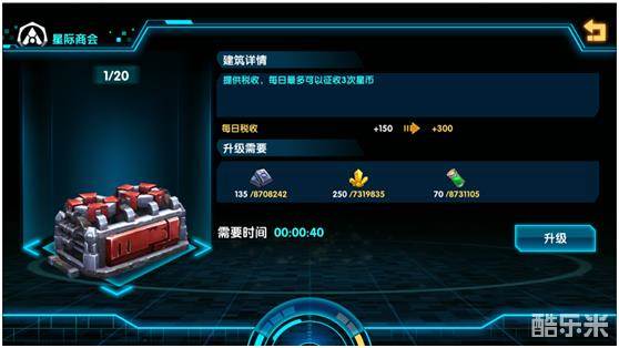 2、选择需要升级的科技,并在弹出的界面点击“升级”,资源足够即可升级此项科技。科技升级一旦完成,获得的资源产量加成或战斗力加成会立即生效,升级达到满级,还会激活技能。如升级“物资港口”,那么玩家拥有的资源上限马上就会提升,物资港口一旦升级到满级,还可以获得技能“税收+1000”。