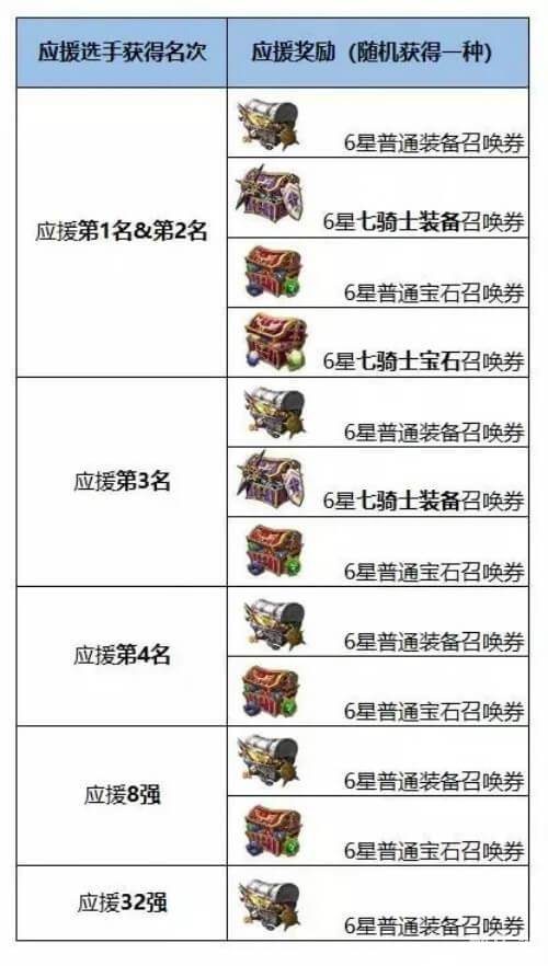 应援的玩家根据应援的选手排名获得不同的奖励。应援选手的排名越高,获得七骑士装备或七骑士宝石的概率就越大。