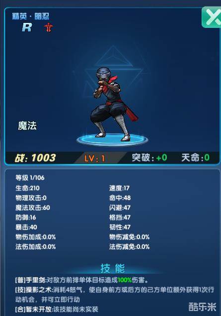 除了露西之外,还有一名好用的伙伴,他就是“暗忍”。他的技能可以让站在他前方或者后方的一名伙伴获得1次额外的行动机会,并可以无视速度立即行动1次。也就是说,在一回合内,他可以使某位伙伴行动两次,再搭配“夏奈”之类的输出英雄,可以瞬间对敌方造成大量伤害。