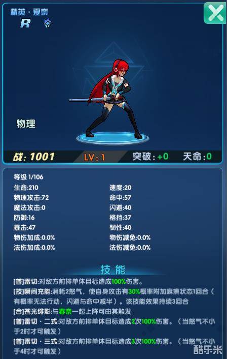 夏奈:她的特点是主要输出手段为普攻,并且在自身怒气越高时,输出越高。在高怒气的情况下,可以对目标进行高频率的强力输出,是个非常强力的单体输出英雄。并且技能能够为自身攻击附加麻痹状态,如果运气好,可以在输出的同时控制目标,让目标无法行动。