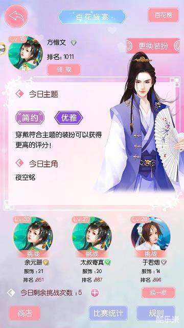 《锦绣奇缘》百花盛宴每天都有不同的挑战主题,玩家根据主题来选择服装更容易获得高分。注意!只是服装属性影响评分,配置的缘卡属性是否合适也会影响最终的评分。