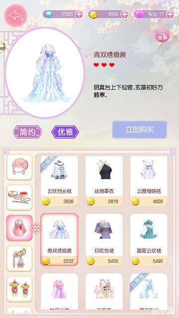 《锦绣奇缘》服装店出售发型、头饰、耳环、颈饰、妆容、衣服、鞋子7种服饰。每一种服饰都拥有多个设计风格的商品,不同审美倾向的玩家都能在服装店找到自己喜欢的服饰。