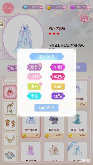 《锦绣奇缘》服饰共有8个属性标签,分别是清凉、保暖、活泼、优雅、简约、华丽、可爱、成熟。每一件服饰都有2个属性。玩家可以使用搜索功能,选择属性标签,筛选出自己需要的服饰