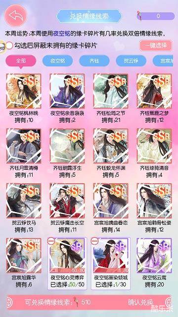 《锦绣奇缘》玩家获得多余的缘卡碎片可在情缘商店兑换成情缘线索。注意!兑换情缘线索时可以根据本周运势选择碎片兑换,有一定几率获得双倍的情缘线索。