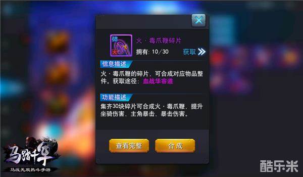 集齐马具碎片,可以合成对应物品整件,提升坐骑和主角的各项属性。勤能补拙,只要多参与新活动血战华容道,高品质马具等你集齐。