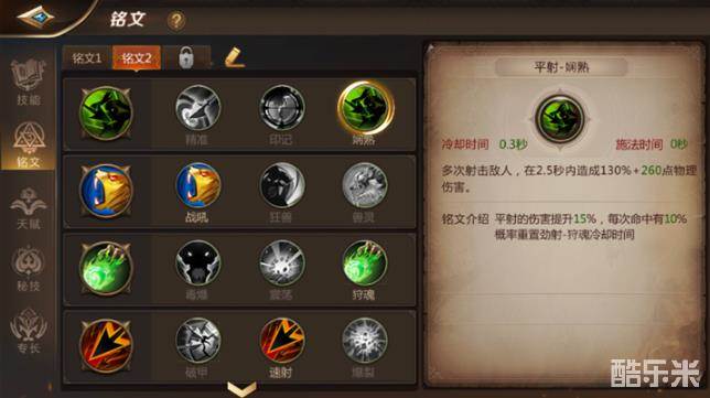 平射-娴熟是猎人的普通攻击技,只要攻击到敌人就有10%概率重置劲射-狩魂的冷却时间。散射技能则使用速射铭文(俗称3连射)。这个输出套路的特点是,只要运气好就可以在短时间内使用多次劲射狩魂,不需要管目标身上有几层毒,就能打出大量的伤害。