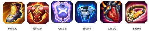 纯肉出装,以抗伤害保护输出为目的。在前期出一件燃烧战甲来贡献伤害,中后期就全肉出装,竟可能更高的叠防御生命属性。