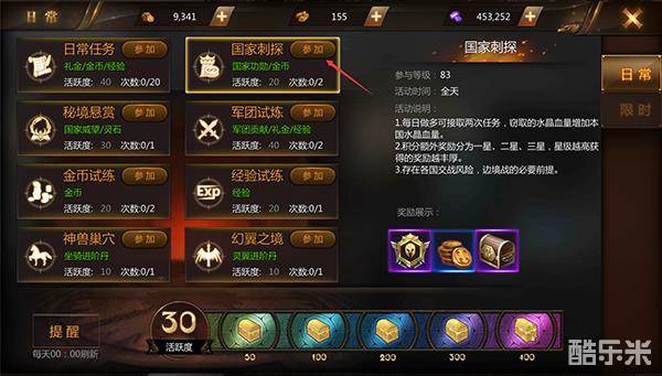 1、点击主界面右上角【活动大厅】-【日常】-【国家刺探】