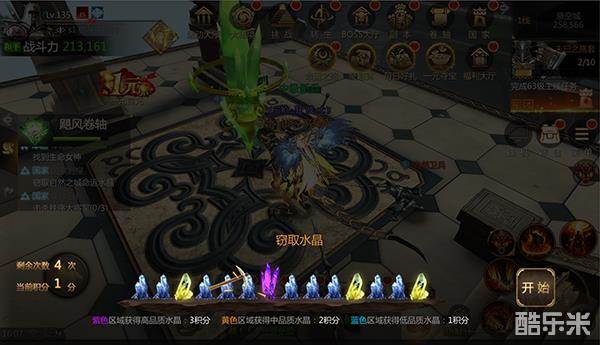 4、水晶分为紫、黄、蓝三色,紫色为3个积分点,黄色为2个积分点,蓝色为1个积分点,敲中哪个颜色的水晶,即获得对应的积分值;