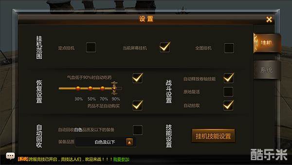 辅助设置:挂机范围、血量恢复设置、自动拾取、是否开启自动回收以及回收的品质选择;