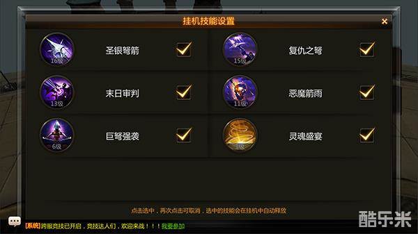 技能设置:点击【挂机技能设置】按钮,弹开技能设置界面。界面会显示玩家所有职业技能和特殊技能,通过勾选选择挂机中要自动释放的技能。