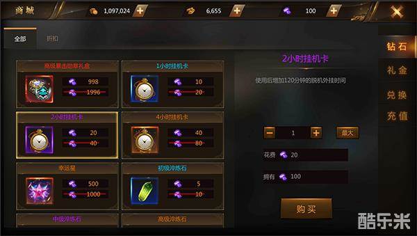 离线挂机时储备:使用钻石可以在商城购买离线挂机卡,使用后获得1小时、2小时、4小时离线挂机时长。